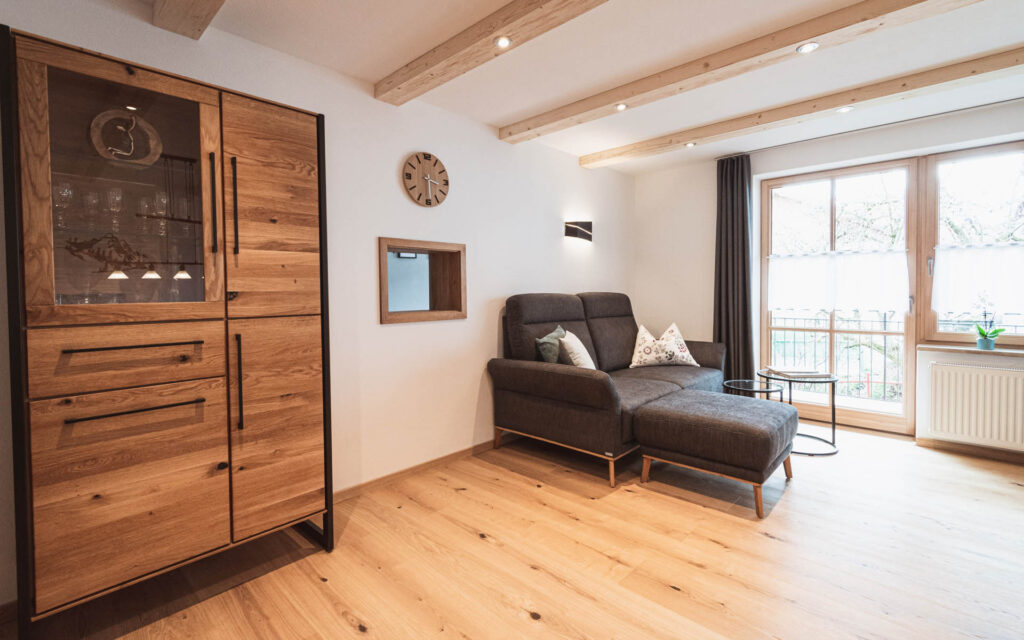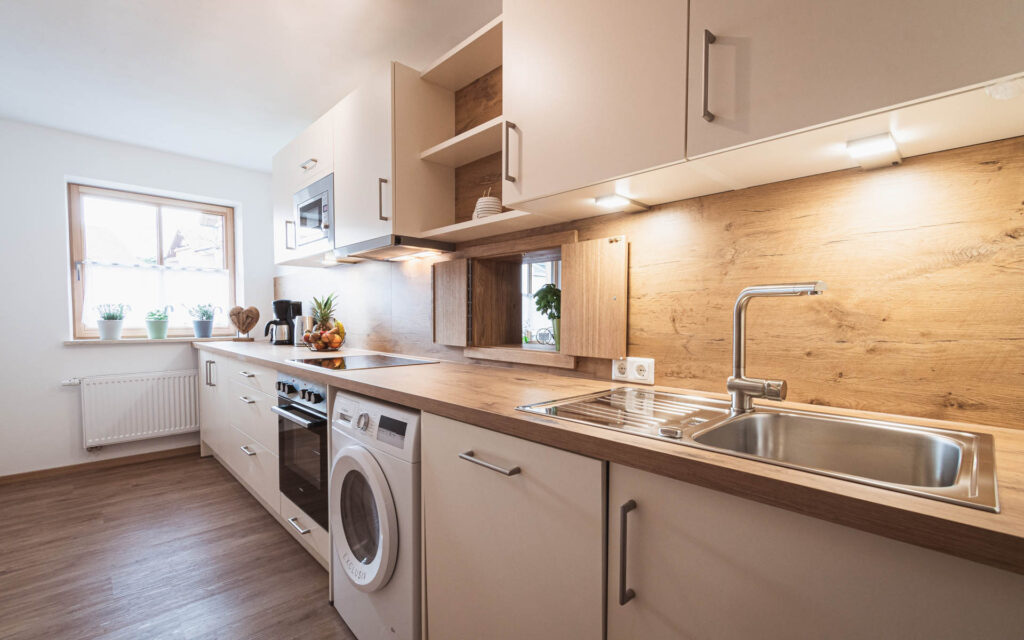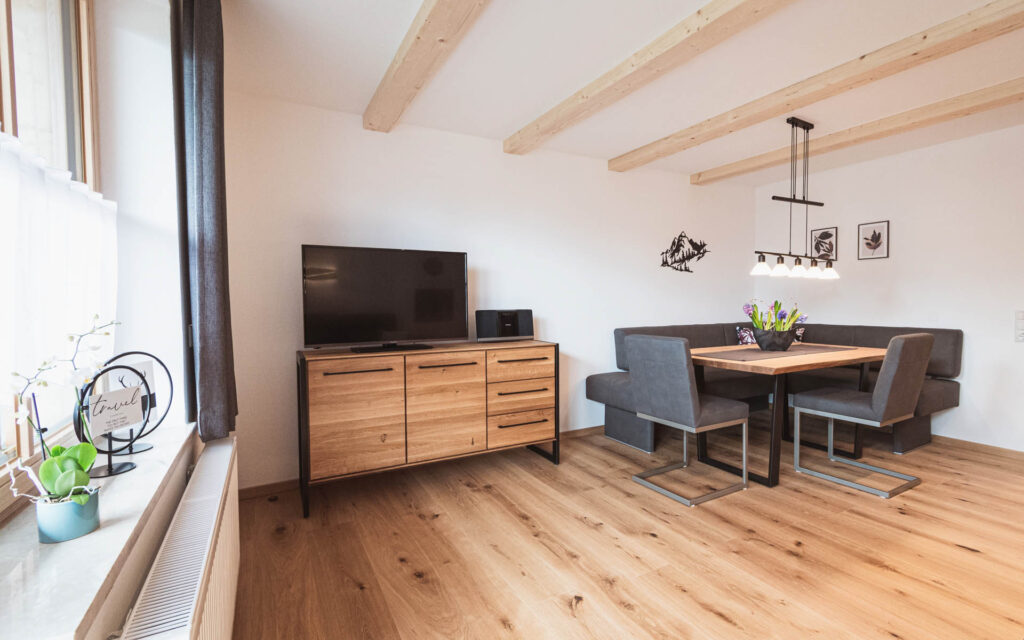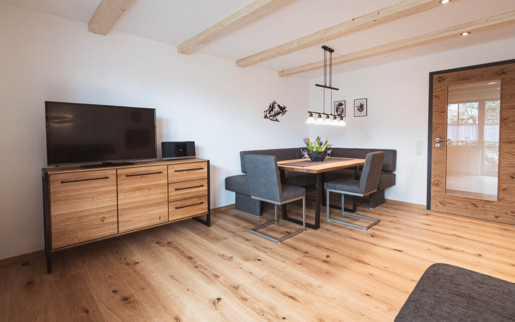 Die Ferienwohnung ist ca. 95qm groß mit zwei Schlafzimmer, moderne, komplett ausgestattete Küche und gemütlichem Wohnzimmer mit gepolsterter Eckbank, großen Holztisch, Sofa und Smart-TV mit Netflix und moderner Stereoanlage mit DAB+.